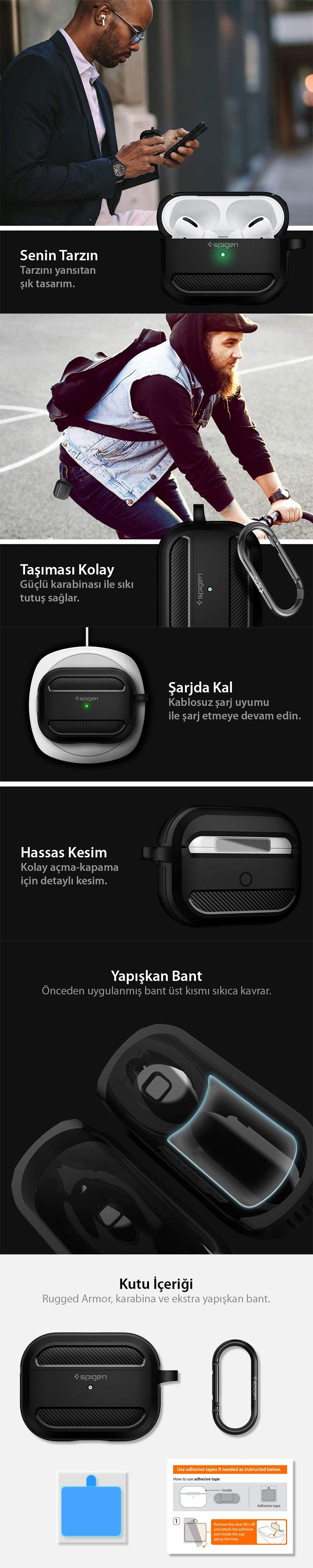 AirPods Pro. Kulaklık Kılıfı, Spigen Rugged Armor Malzeme: Termoplastik Poliüretan ● Karbon fiber yapı, ince ve şık tasarım ● Ergonomik yapısı ile cep dostu tasarım ● Kolay taşınabilirlik için bir anahtarlık içerir ● İçindeki yumuşak mikro fiber yapısı ile temiz ve çiziksiz koruma sağlar