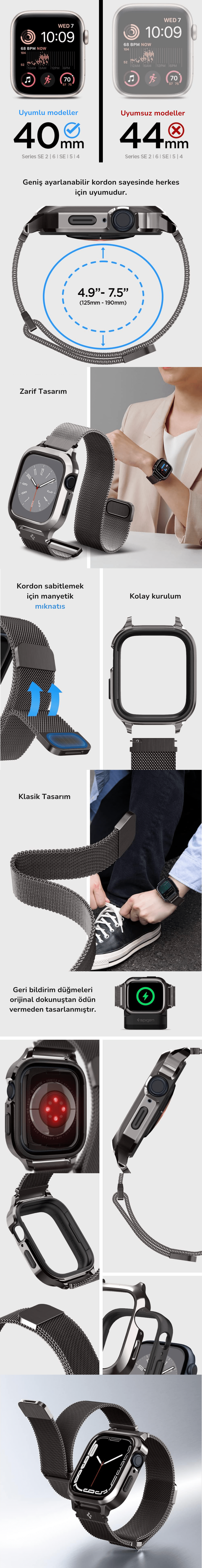 Spigen Apple Watch 41mm (Seri 9/8/7) Kılıf & Kordon Kayış Metal Fit Pro Graphite - ACS04587
