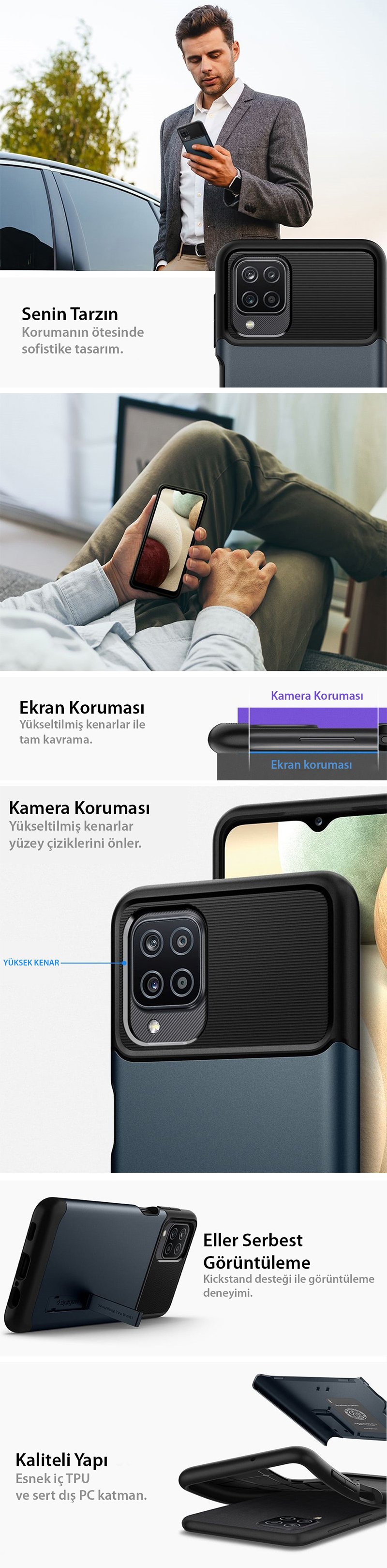 Galaxy A12 Kılıf, Spigen Slim Armor Malzeme: Termoplastik Poliüretan, Polikarbonat ● Sert düşmelere karşı çift katmanlı koruma ● Ergonomik yapısı ile cep dostu tasarım ● Dahili bir kickstand ile mükemmel görüntüleme deneyimi ● Air Cushion Technology® ile Mil-grade sertifikalı ● Benzersiz tasarım ve olağanüstü görünüm ● Çizilme ve darbelere karşı güçlü koruma