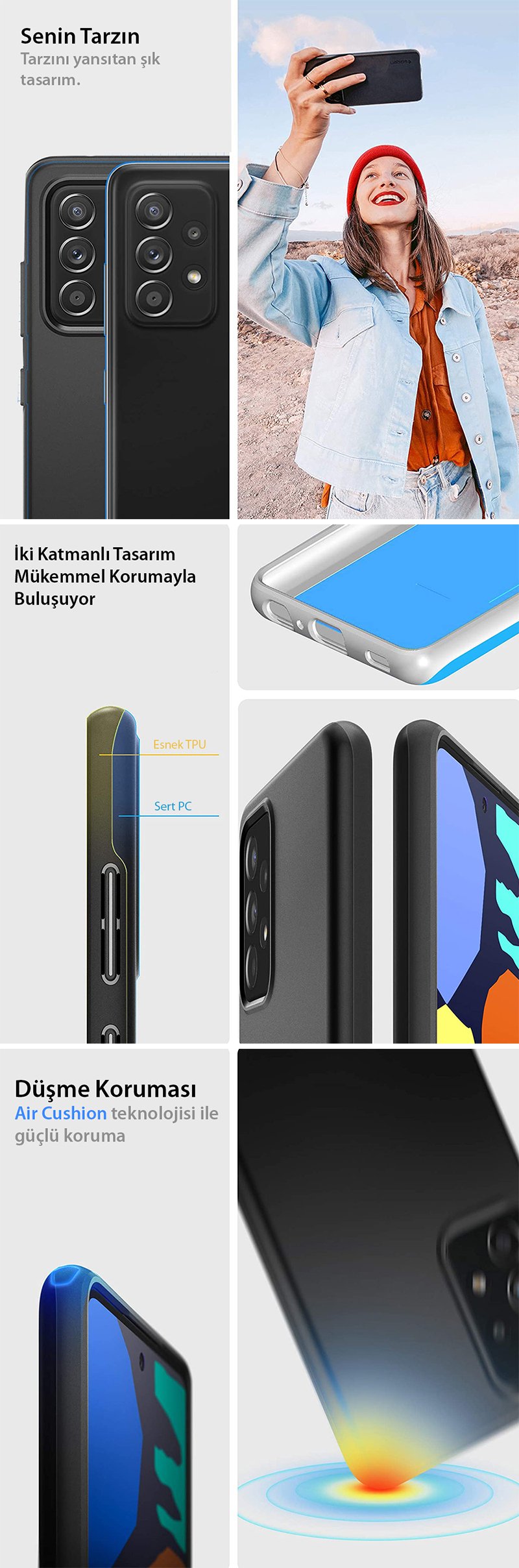 Galaxy A52 Kılıf, Spigen Thin Fit Malzeme: Termoplastik Poliüretan ● Ergonomik yapısı ile cep dostu tasarım ● Kaymaz kaplama ile günlük çizilme koruması ● Şık ve zarif kesikler, kolay erişim ● Air Cushion Technology® ile Mil-grade sertifikalı ● Çizilme ve darbelere karşı güçlü koruma ● Benzersiz tasarım ve olağanüstü görünüm