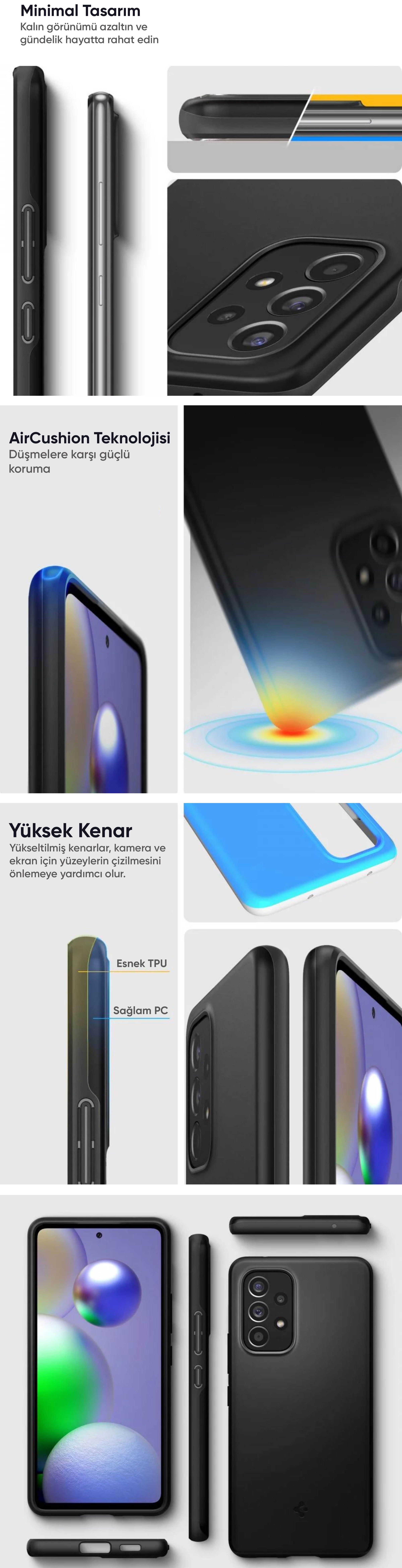 Galaxy A53 5G Kılıf, Spigen Thin Fit ● Benzersiz tasarım, olağanüstü görünüm ● Çizilme ve darbelere karşı güçlü koruma ● Birinci sınıf mat kaplamalı hafif ince profil ● Esnek ve şok emici bir katmandan yapılmıştır ● Günlük yaşamınız için yumuşak ve kavrama dostu ● Sağlam geri bildirim ve kolay basma için dokunsal düğmeler ● Ekstra şok emilimi için yeni aşırı darbe köpüğü ● Esnek iç ve dayanıklı dış yüzeye sahip çift katmanlı gövde ● Dayanıklı ama ince bir tasarım elde etmek için PC ve TPU'nun Air Cushion Teknolojisine sahip hibrit yapısı ● Çizilmeye karşı dayanıklı PC, telefonu hafif ve cep dostu tutar.
