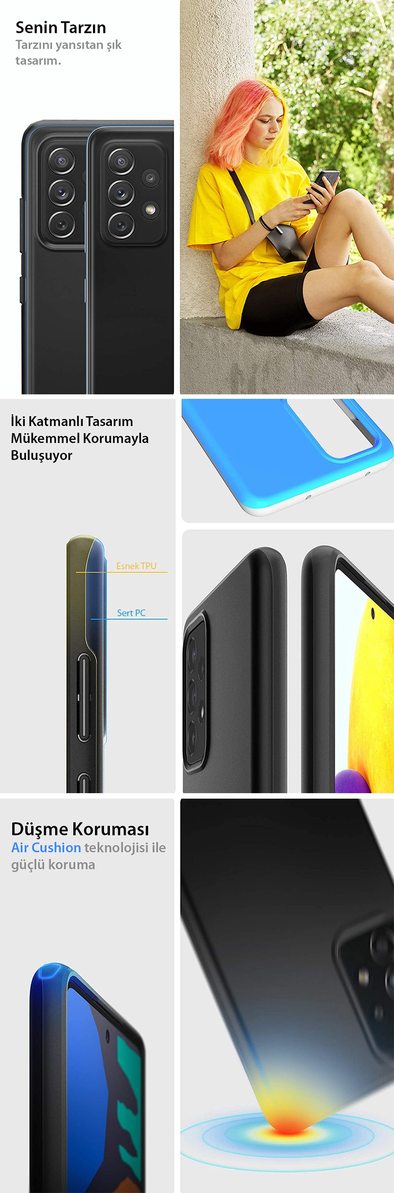 Galaxy A72 Kılıf, Spigen Thin Fit Malzeme: Termoplastik Poliüretan ● Ergonomik yapısı ile cep dostu tasarım ● Kaymaz kaplama ile günlük çizilme koruması ● Şık ve zarif kesikler, kolay erişim ● Air Cushion Technology® ile Mil-grade sertifikalı ● Çizilme ve darbelere karşı güçlü koruma ● Benzersiz tasarım ve olağanüstü görünüm