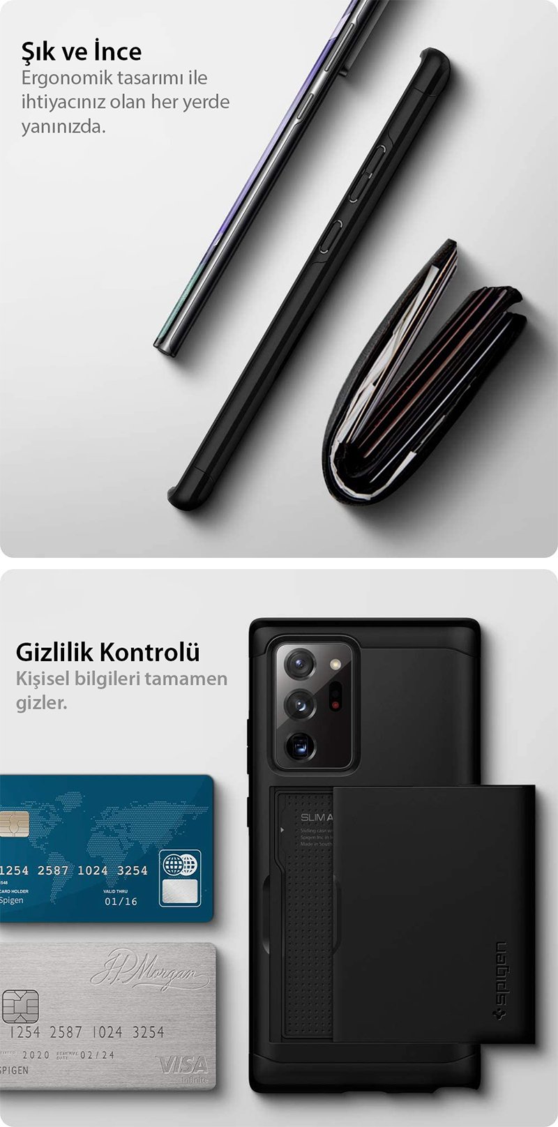 Galaxy Note 20 Ultra Kılıf, Spigen Slim Armor CS Malzeme: Termoplastik Poliüretan, Polikarbonat ● En fazla iki kart ve nakit depolar (Kablosuz şarjdan önce çıkarın) ● Yükseltilmiş kenarlı esnek ve hafif tpu katmanı, telefon ekranı ve kamerasını korur ● Air Cushion Technology® ile Mil-grade sertifikalı ● Benzersiz tasarım ve olağanüstü görünüm ● Çizilme ve darbelere karşı güçlü koruma ● Kablosuz şarj ile uyumlu