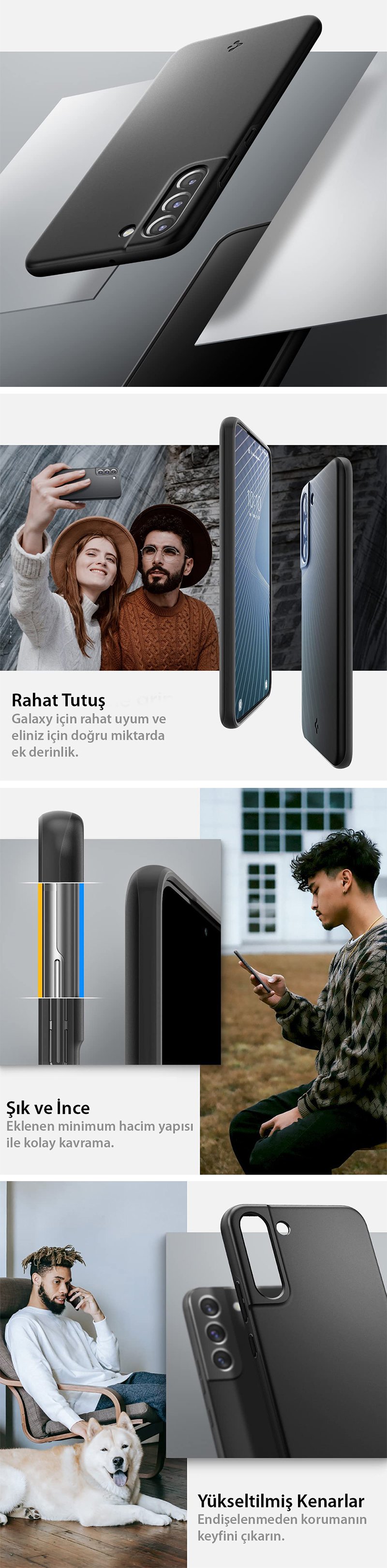 Galaxy S22 5G Kılıf, Spigen Thin Fit ● Tamamen mat ve siyah kaplama ● Minimalist şık tasarım ● Hassas kesimler ve dokunsal düğmeler, hızlı erişim ve geri bildirim sağlar ● Manyetik araba tutacağı metal plakaları için dahili yuva (kablosuz şarj için çıkarın) ● Benzersiz tasarım ve olağanüstü görünüm ● Çizilme ve darbelere karşı güçlü koruma ● Kablosuz şarj ile uyumlu