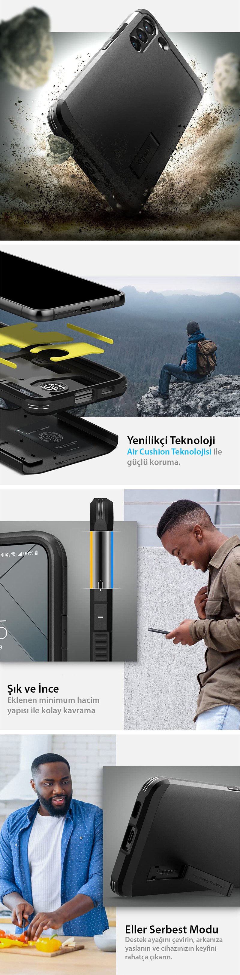 Galaxy S22 Plus 5G Kılıf, Spigen Tough Armor Military Grade ● Geleneksel darbe emici birinci sınıf TPU malzemesinin üç katmanlı yapısı, ek koruma sağlarken hafif bir his sağlarken daha fazla koruma sağlar ● Hava yastığı teknolojisi, düşmenin etkisini engellemek için dört köşedeki darbeleri emer ve kasanın iç kısmına örümcek ağı tasarımı uygulanır ● Ekstra şok emilimi için yeni aşırı darbe köpüğü ● Esnek iç ve dayanıklı dış yüzeye sahip çift katmanlı gövde ● Çizilmeye karşı dayanıklı PC, telefonu hafif ve cep dostu tutar