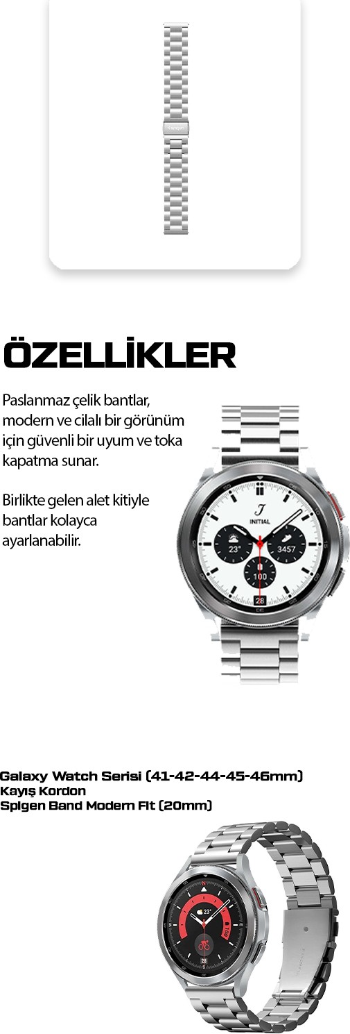 Spigen Samsung Galaxy Watch Serisi (40mm / 41mm / 42mm / 43mm / 44mm / 45mm / 46mm / 47mm) Kayış Kordon, Spigen Band Modern Fit (20mm) Silver