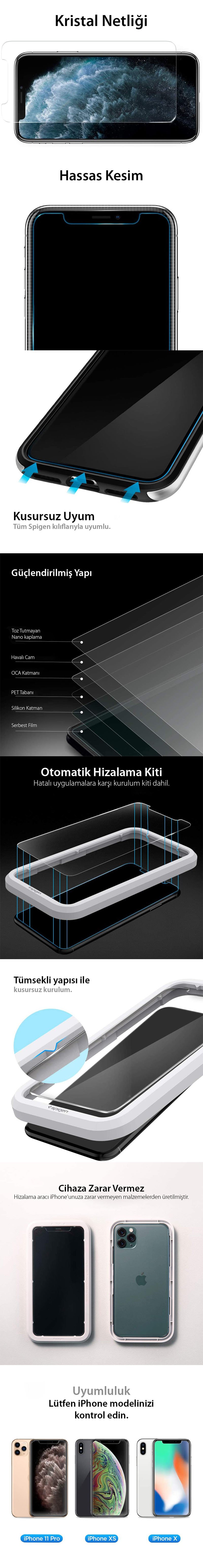 iPhone 11 Pro / XS / X Cam Ekran Koruyucu Kolay Kurulum, Spigen AlignMaster Glas tR Malzeme: 9H Havalı Cam ● Mühendislik tasarımı kolay ve zahmetsiz kurulum ● 9h Premium temperli cam koruması ● Oleofobik kaplama sayesinde parmak izi, leke izi tutmaz