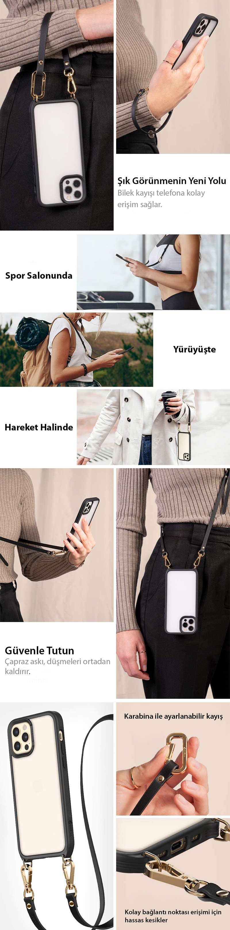 iPhone 12 / iPhone 12 Pro Kılıf, Spigen Ciel by Cyrill Classic Charm Malzeme: Polikarbonat, Termoplastik Poliüretan ● Bileklik veya kolye olarak kullanabileceğiniz şık bir askılı kılıf ● Altın detaylı ayarlanabilir siyah suni deri kayış ile birlikte gelir. (Kayış uzunluğu: 5,42 inç) ● Pürüzsüz, mat, yarı şeffaf arka kısım ● Kablosuz şarj / MagSafe uyumlu