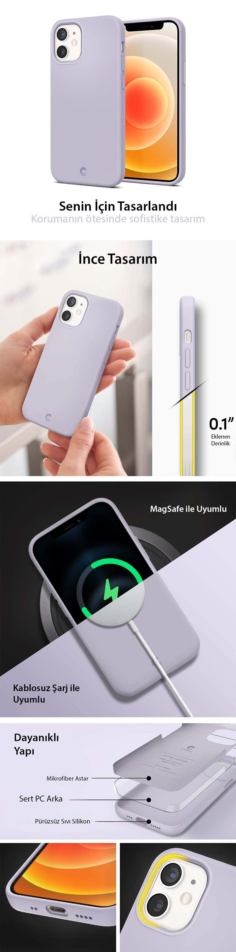 iPhone 12 Mini Kılıf, Spigen Ciel by Cyrill Silicone Malzeme: Polycarbonate, Silikon ● Yumuşak mikrofiber, telefonunuzu çizilmelere ve toza karşı korumak için kasanın içini kaplar ● İstenmeyen darbelere ve düşmelere karşı dayanıklı ● Benzersiz tasarım ve olağanüstü görünüm ● Çizilme ve darbelere karşı güçlü koruma ● Kablosuz şarj uyumlu
