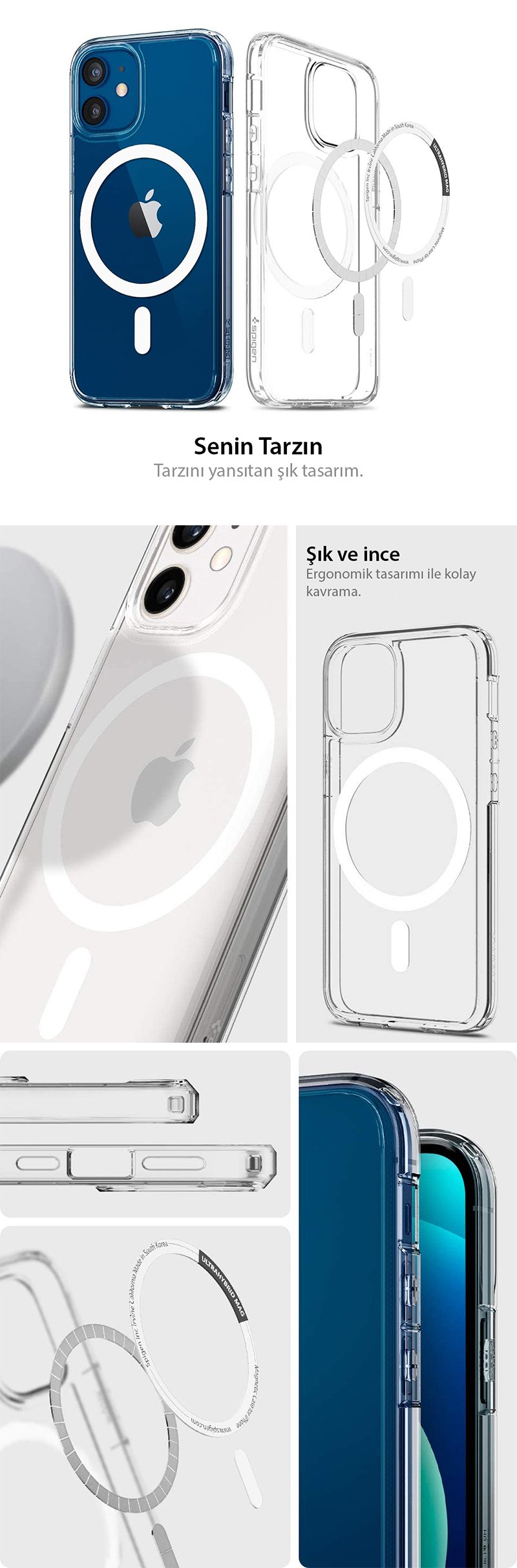iPhone 12 Mini Kılıf, Spigen Ultra Hybrid Mag (Magsafe Uyumlu) Malzeme: Termoplastik poliüretan, Polikarbonat ● Güçlendirilmiş MagSafe bağlantıları için yerleşik manyetik halka ● Kristal netliğinde şeffaflık, orijinal telefon tasarımını gözler önüne seriyor ● Yükseltilmiş çerçeveler ekranı ve kamerayı düz yüzeylerden korur ● Dokunsal geri bildirim ve ek ayrıntılar içeren belirgin düğmeler ● Air Cushion Technology® ile mil sınıfı sertifikalı düşme koruması
