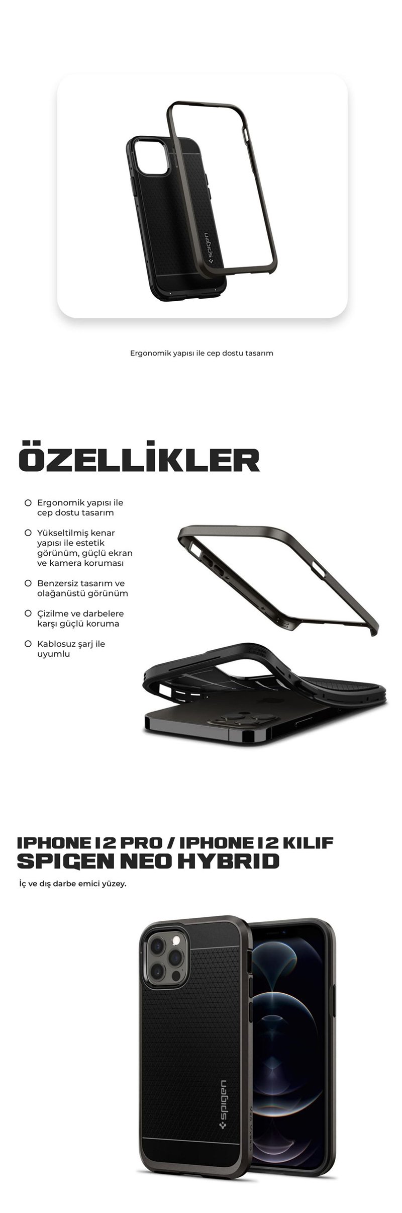 iPhone 12 Pro / iPhone 12 Kılıf, Spigen Neo Hybrid Malzeme: Polikarbonat - Termoplastik Poliüretan ● Günlük darbelere dayanıklı yapı ● Ergonomik yapısı ile cep dostu tasarım ● Ekran ve kamera koruması için arttırılmış koruma yapısı ● Benzersiz tasarım ve olağanüstü görünüm ● Çizilme ve darbelere karşı güçlü koruma ● Kablosuz şarj ile uyumlu