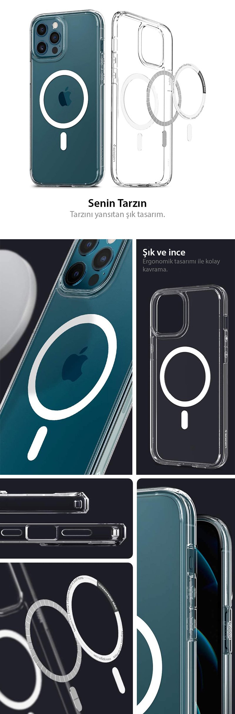 iPhone 12 Pro Max Kılıf, Spigen Ultra Hybrid Mag (MagSafe Uyumlu) ● MagSafe için yerleşik halka ● Şarj hızınızı arttırmak için tasarlandı ● Günlük kullanım için ince ve kolay tutuş ● Air Cushion Technology® ile Mil-grade sertifikalı ● Minimal desenli ince tasarım, mükemmel tutuş ve parmak izi koruması ● Zaman içinde mıknatıslı şarj cihazı sıkıştırmasından kaynaklı dairesel izler görülebilir