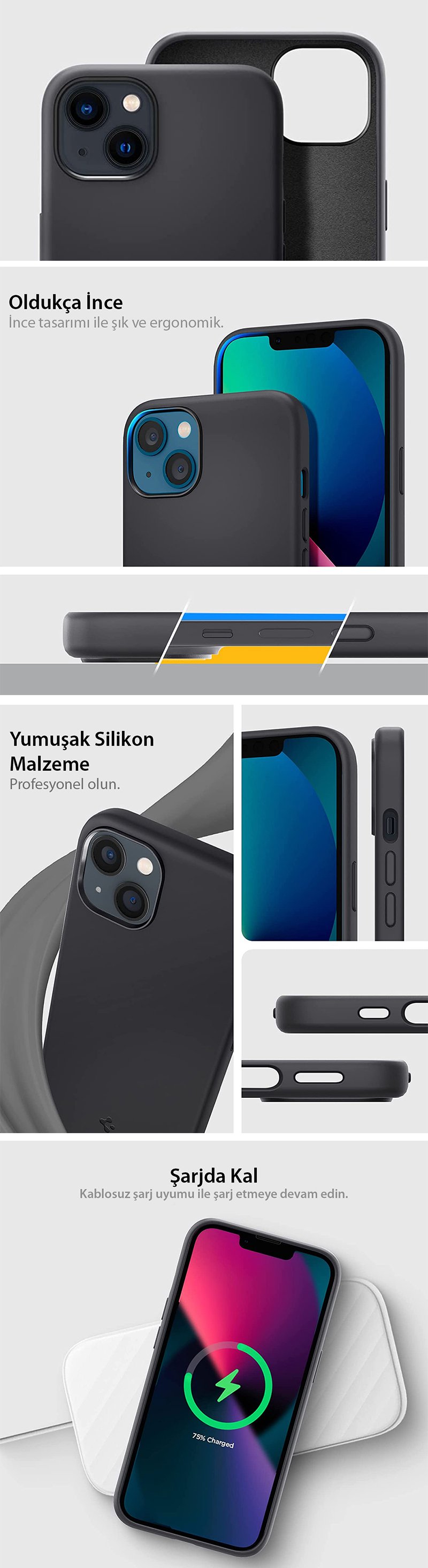 iPhone 13 Mini Kılıf, Spigen Silicone Fit ● Benzersiz tasarım, olağanüstü görünüm ● Çizilme ve darbelere karşı güçlü koruma ● Kablosuz şarj ile uyumlu ● iPhone 13 Mini için tasarlandı. ● Günlük yaşamınız için yumuşak ve kavrama dostu ● Dokunsal geri bildirim ve ek ayrıntılar içeren belirgin düğmeler ● Air Cushion Technology® ile mil sınıfı sertifikalı düşme koruması ● Ekstra şok emilimi için yeni aşırı darbe köpüğü ● Esnek iç ve dayanıklı dış yüzeye sahip çift katmanlı gövde ● Çizilmeye karşı dayanıklı PC, telefonu hafif ve cep dostu tutar. ● Telefonunuzun yeni gibi görünmesini sağlayan akıllı bir tasarım