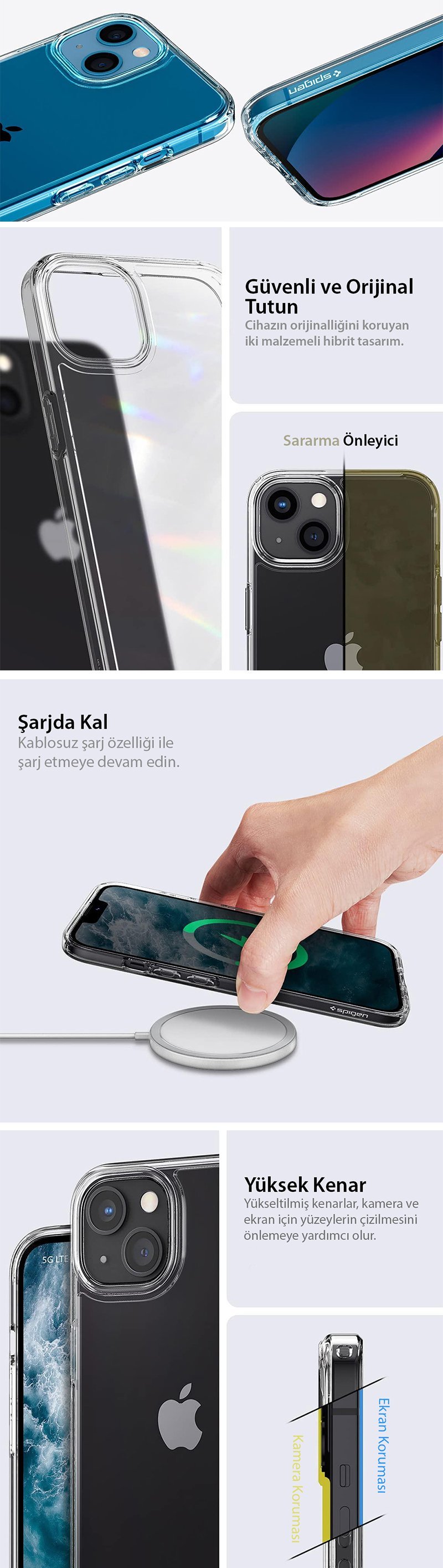 iPhone 13 Mini Kılıf, Spigen Ultra Hybrid ● Benzersiz tasarım, olağanüstü görünüm ● Çizilme ve darbelere karşı güçlü koruma ● İnce ve hibrit bir yapıda inşa edilmiştir. ● Sert bir sırt ile daha uzun süreli netlik ● Günlük kullanım için ince ve kavrama dostu ● Air Cushion Technology® ile Mil dereceli sertifikalı ● Kablosuz şarj ile uyumlu ● Dayanıklı bir PC sırtlı TPU tampondan yapılmış hibrit teknoloji ● Kristal berraklığında şeffaflık, orijinal telefon tasarımını gözler önüne serer. ● Yükseltilmiş çerçeveler ekranı ve kamerayı düz yüzeylerden kaldırır. ● Belirgin düğmelerin hissedilmesi ve basılması kolaydır, büyük kesikler çoğu kabloya uyar.