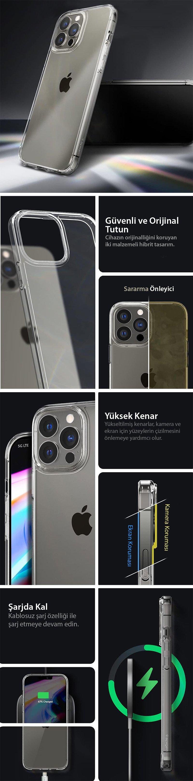 iPhone 13 Pro Max Kılıf, Spigen Ultra Hybrid ● Benzersiz tasarım, olağanüstü görünüm ● Çizilme ve darbelere karşı güçlü koruma ● Kablosuz şarj ile uyumlu ● iPhone 13 Pro Max için tasarlandı. ● Birinci sınıf mat kaplamalı hafif ince profil ● Esnek ve şok emici bir katmandan yapılmıştır. ● Günlük yaşamınız için yumuşak ve kavrama dostu ● Sağlam geri bildirim ve kolay basma için dokunsal düğmeler ● Ekstra şok emilimi için yeni aşırı darbe köpüğü ● Esnek iç ve dayanıklı dış yüzeye sahip çift katmanlı gövde ● Dayanıklı ama ince bir tasarım elde etmek için PC ve TPU'nun Air Cushion Teknolojisine sahip hibrit yapısı ● Çizilmeye karşı dayanıklı PC, telefonu hafif ve cep dostu tutar. ● Sert bir sırt ile daha uzun süre kalıcı netlik ● Ultra Hybrid®, iPhone 13 Pro Max'in şık tasarımını sergilerken ona hak ettiği korumayı sağlamak için en uygun kılıftır.