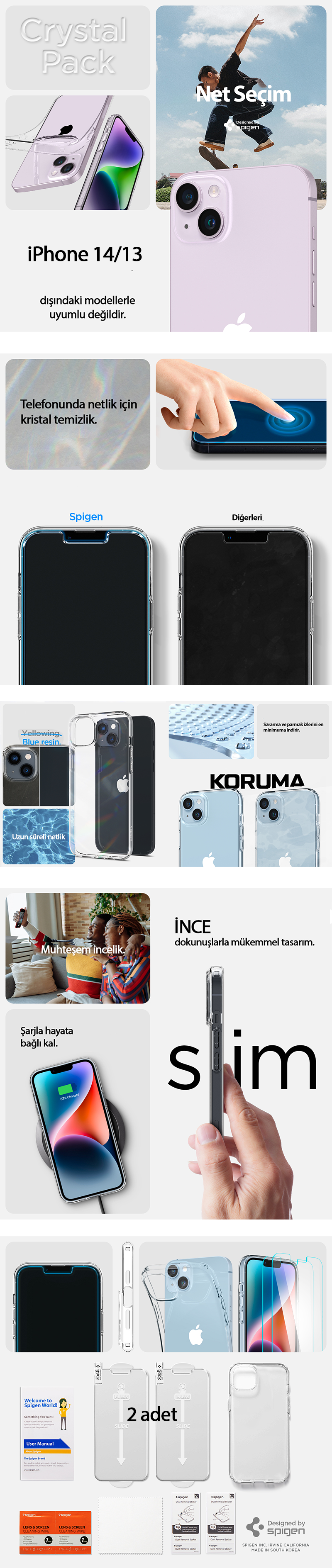 iPhone 14 / iPhone 13 Kılıf, Spigen Crystal Pack + Spigen Glas.tR Slim HD (2 Adet) 360* Cam Ekran Koruyucu Crystal Clear