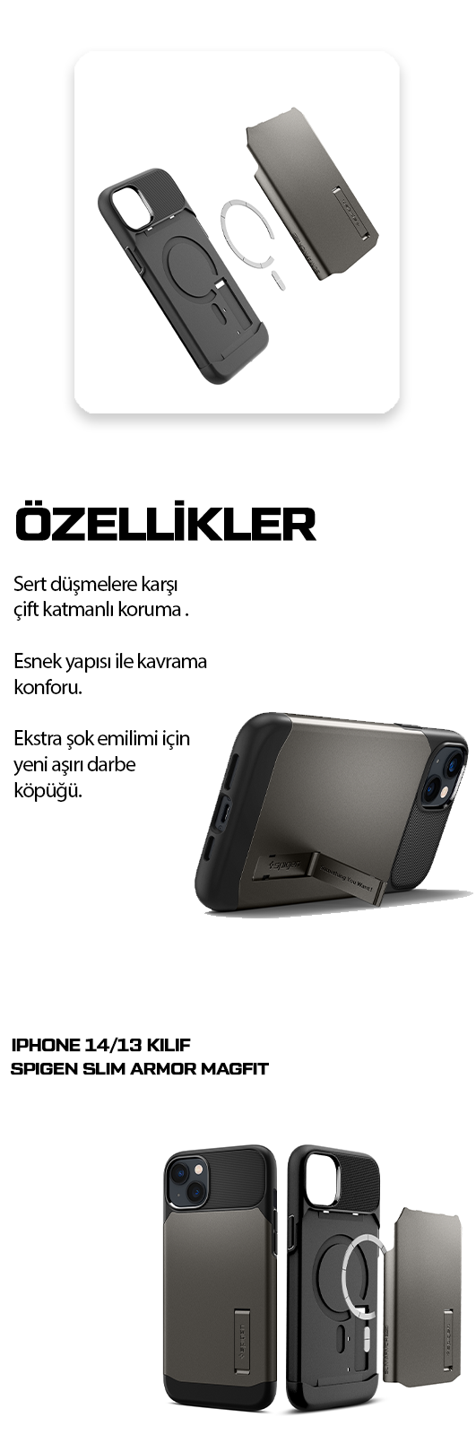 ● Slim Armor® MagSafe Uyumlu, cep dostu kalırken ekstra koruma sağlayan manyetik halka yükseltmeli bir klasiktir