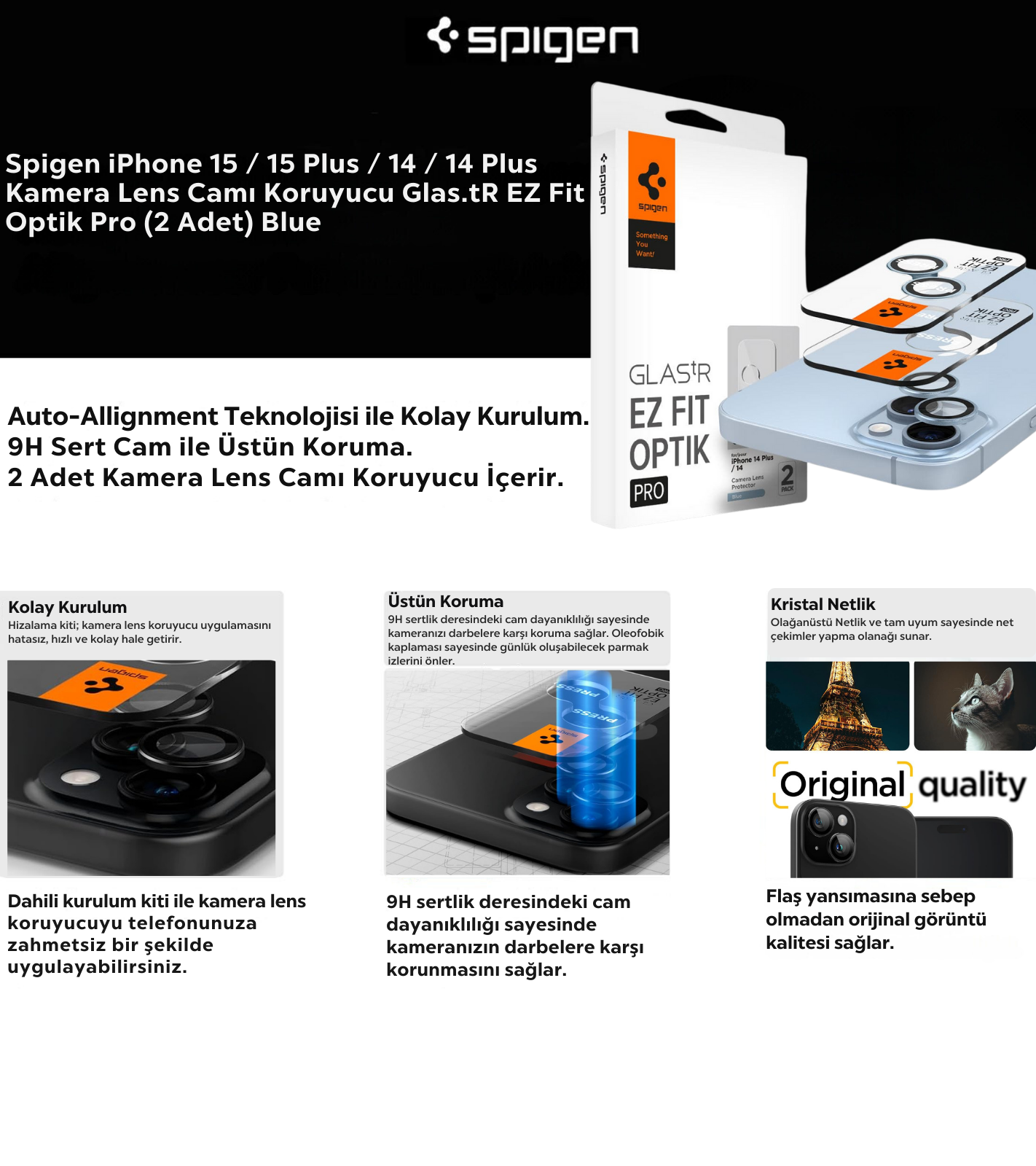 Spigen Apple iPhone 15 / 15 Plus / 14 / 14 Plus ile Uyumlu Kamera Lens Camı Koruyucu Kolay Kurulum GLAS.tR EZ Fit Optik Pro (2 Adet) Blue - AGL05602