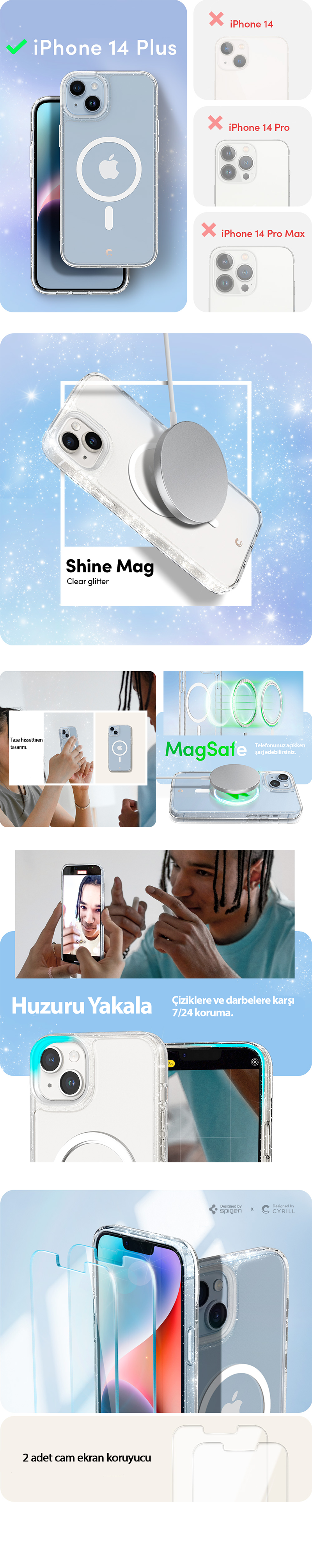 Spigen Ciel by CYRILL Apple iPhone 14 Plus ile Uyumlu Kılıf Shine Mag MagSafe özellikli 360 + Cam Ekran Koruyucu (2 Adet) Clear Glitter - ACS04942