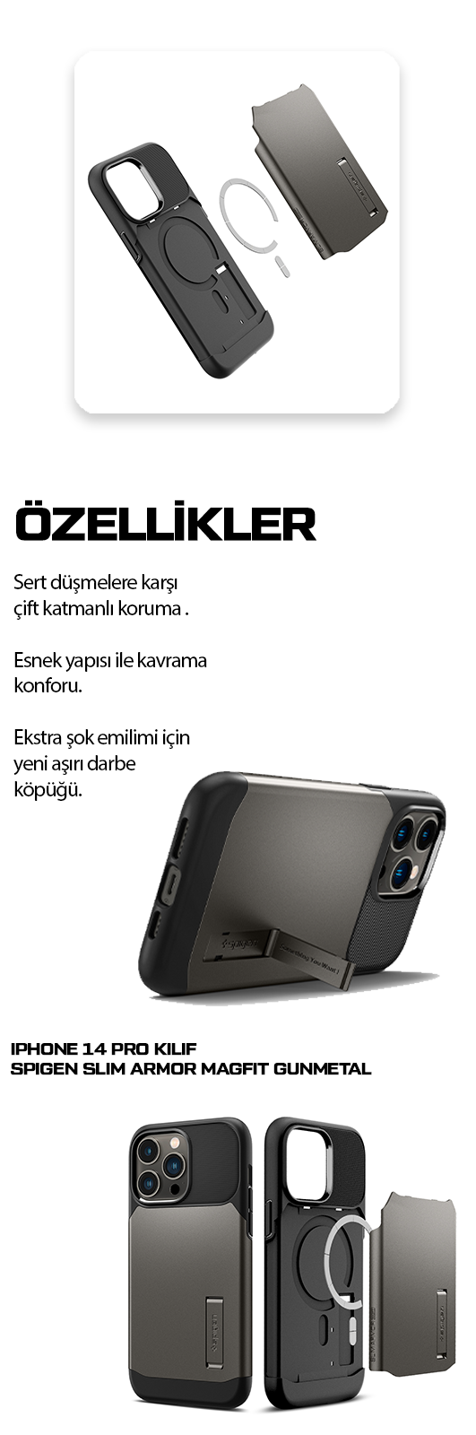 ● Slim Armor® MagSafe Uyumlu, cep dostu kalırken ekstra koruma sağlayan manyetik halka yükseltmeli bir klasiktir