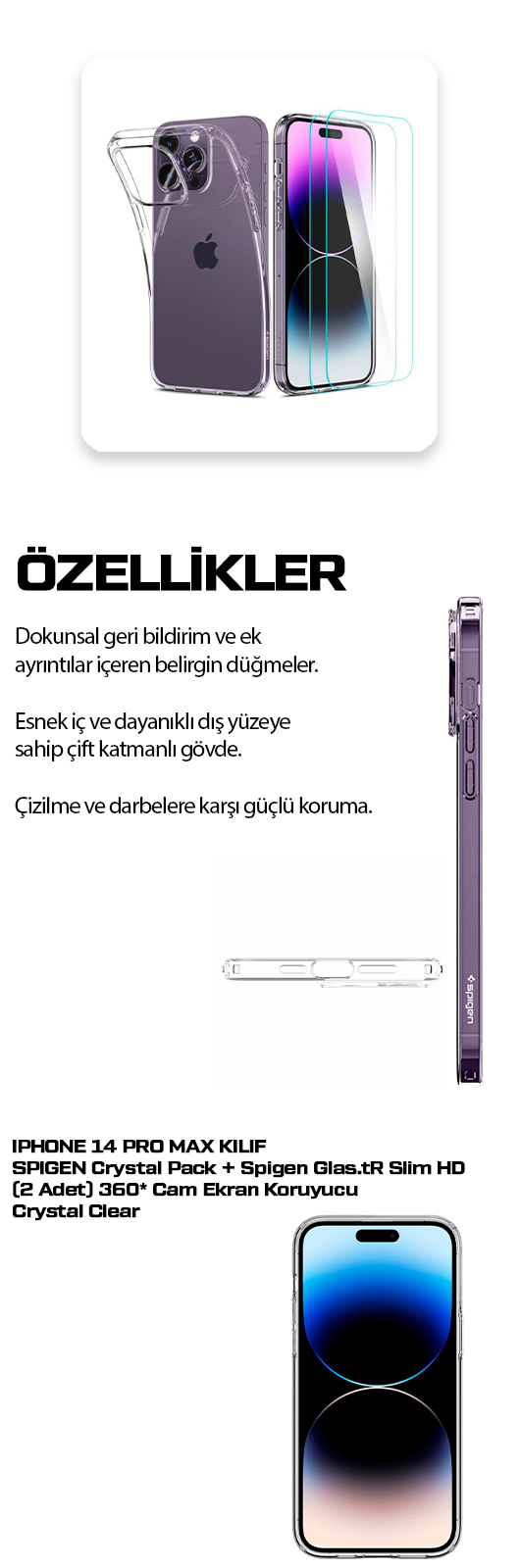 iPhone 14 Pro Max Kılıf, Spigen Crystal Pack + Spigen Glas.tR Slim HD (2 Adet) 360* Cam Ekran Koruyucu Crystal Clear