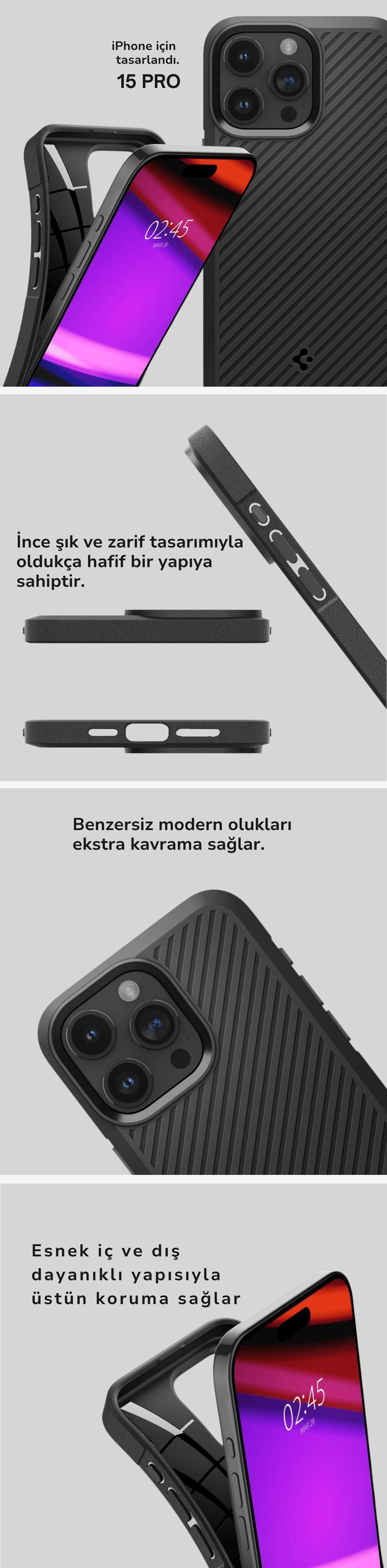 iPhone 15 Pro Kılıf, Spigen Core Armor ● Şık ve zarif kesikler, kolay erişim ● Ergonomik ve ince tasarımı ile cep dostu ● Minimal tasarım, en üst düzey koruma ● Benzersiz tasarım ve olağanüstü görünüm ● Çizilme ve darbelere karşı güçlü koruma ● Kablosuz şarj ile uyumlu