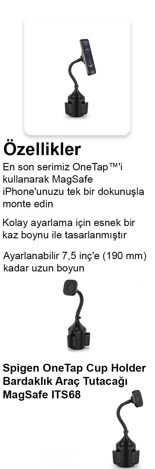 Spigen OneTap Cup Holder Bardaklık Araç Tutacağı MagSafe iPhone 14 / iPhone 13 / iPhone 12 Serisi ile Uyumlu ITS68 ● En son serimiz OneTap™'i kullanarak MagSafe iPhone'unuzu tek bir dokunuşla monte edin. ● Kolay ayarlama için esnek bir kaz boynu ile tasarlanmıştır. ● OneTap, en yeni OneTap Teknolojimizi kullanarak zahmetsizce yerine oturmasını sağlayan güçlü yerleşik mıknatıslara sahiptir ● Ayarlanabilir 7,5 inç'e (190 mm) kadar uzun boyun ● Taban Min'den ayarlanabilir. 2,95" (75 mm) - Maks. 4” (103 mm) ● MagSafe iPhone 15/14/13/12 Serileri ile Uyumludur